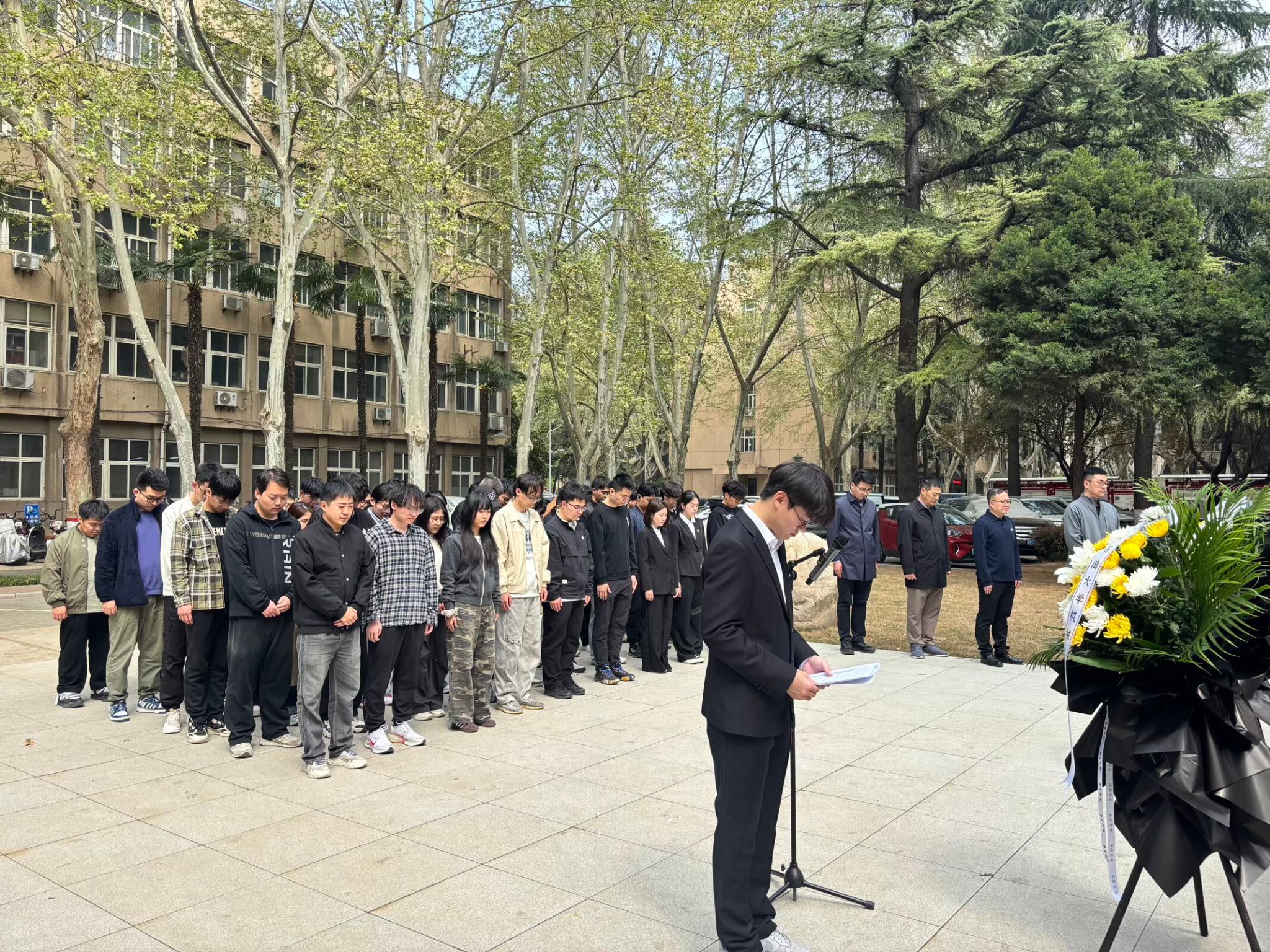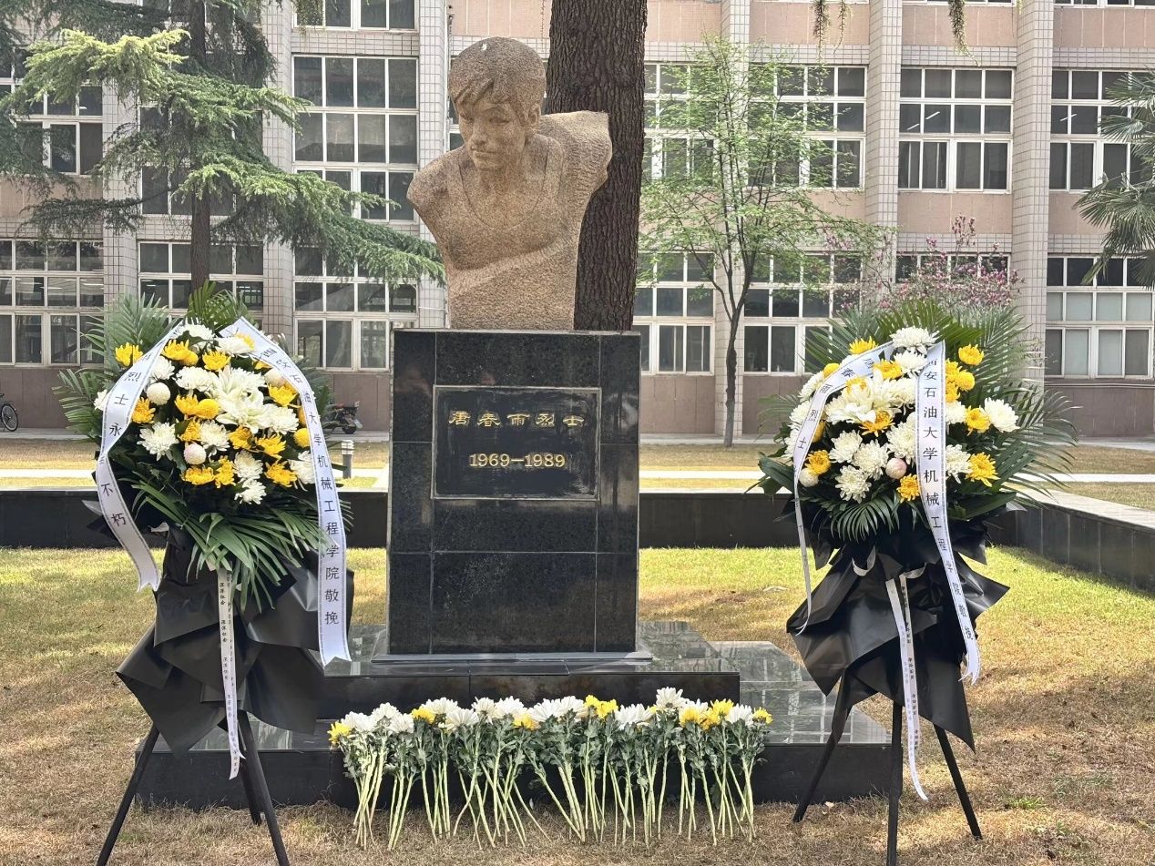 祭扫仪式上,孟开元、刘少胡代表学院整理了花圈挽联,随后全体师生依次瞻仰唐春雨烈士塑像,敬献鲜花、鞠躬致敬,并默哀一分钟,表达对唐春雨烈士的深切哀思与无限缅怀。