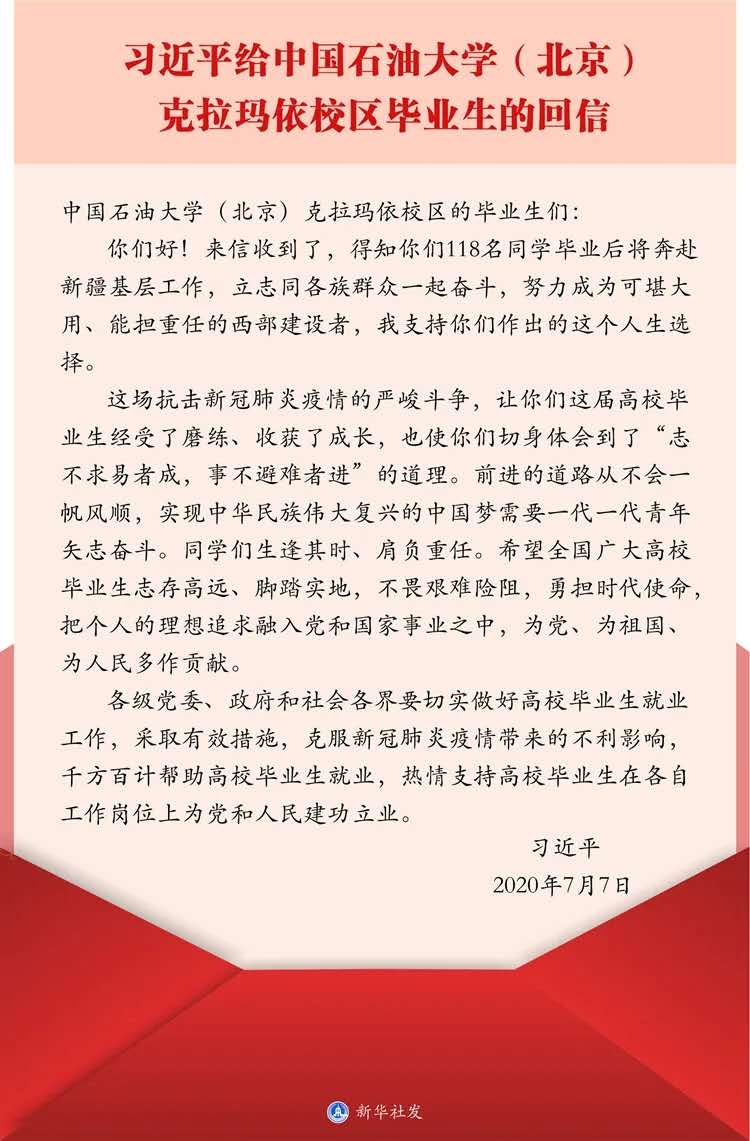 中共中央总书记、国家主席、中央军委主席习近平7月7日给中国石油大学(北京)克拉玛依校区毕业生回信,肯定他们到边疆基层工作的选择,对广大高校毕业生提出殷切期望。习近平总书记这封饱含期待与鼓励的回信,在AC米兰中文青年学子中迅速引发了热议。