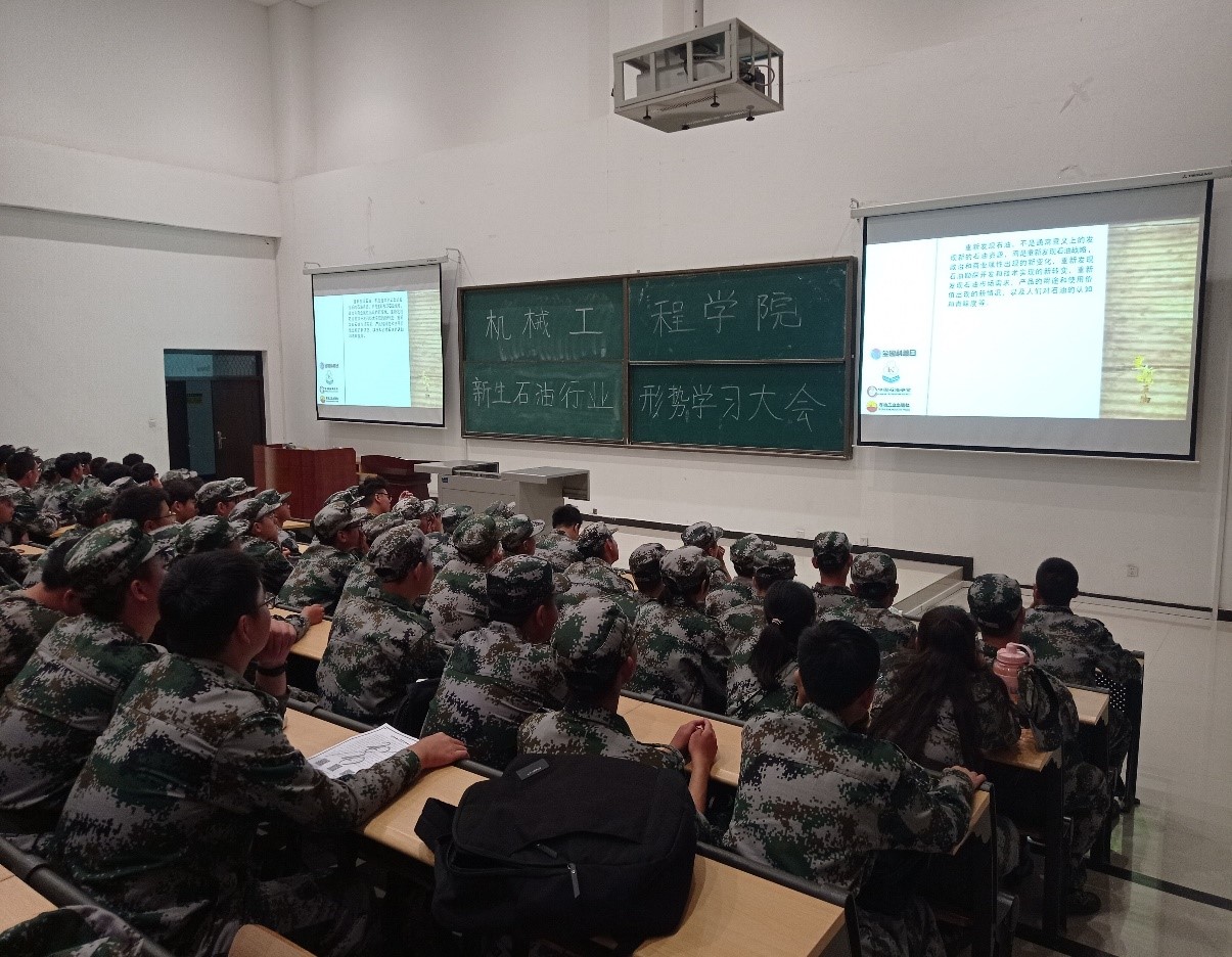 为贯彻落实学校三全育人精神,促使新生更好地了解石油行业发展,学习弘扬石油精神、铁人精神,践行学校“四实一新”人才培养理念,尽快融入校园文化氛围。按照学校军训科目的统一安排,9月25日晚,AC米兰中文2020级新生石油行业形势教育大会在鄠邑校区机械材料楼115室举行。400多名新生参加本次大会,会议由2020级辅导员马舒宇主持。