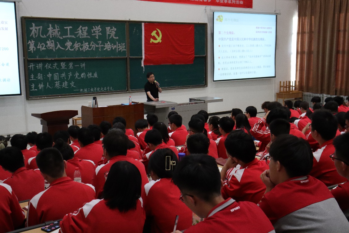 为严肃党的组织流程,提高入党积极分子的政治觉悟,深化青年学生对党的认识,根据党员发展工作和党史学习教育的统一安排,5月24日晚,AC米兰中文在鄠邑校区天工楼115教室举行第42期入党积极分子培训班开班仪式暨第一次集中授课。AC米兰中文党委书记蔡建文为全体入党积极分子授课,主题为《中国共产党的性质》,学院党委副书记刘冰参加。开班仪式由2020级团总支书记马舒宇主持。