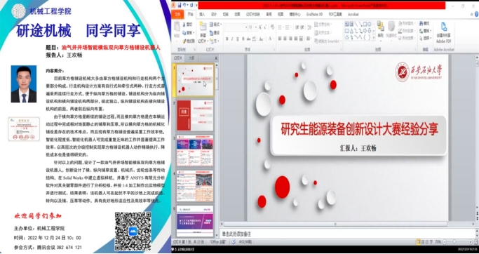 20221224“车谷杯”第九届中国研究生能源装备创新设计大赛获奖者王彤、李家辉和王欢畅分别分享了自己的设计成果、经验与心得,会后就同学们提出的问题做出解答,为同学们下一步参赛作参考。