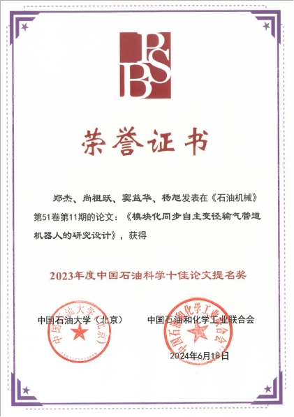 6月18日,由中国石油大学(北京)、中国石油和化学工业联合会及《石油科学通报》共同组织,经网评与会评选出的“2023年度中国石油科学十佳论文”评选结果揭晓,我校为第一单位,第一作者郑杰副教授,通讯作者窦益华教授发表在《石油机械》2023年第11期的文章“模块化同步自主变径输气管道机器人的研究设计”获2023年度中国石油科学十佳论文提名奖,张来斌院士亲自给通讯作者窦益华教授颁奖。此次,共评出“2023年度中国石油科学十佳论文” 10篇、提名奖论文13篇,均是当年在石油科学领域中文期刊上发表的最具创新性和重要性的论文,内容涵盖石油地质、石油地球物理、石油工程、石油机械、石油化学、石油经济及交叉学科等石油科学各个方向。