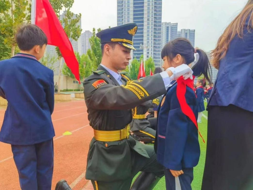 校领导、家长代表、中队辅导员以及我校退役大学生士兵代表为新入队少先队员佩戴红领巾,新队员们此刻肩负起了传承红色基因、弘扬爱国精神的重任。
