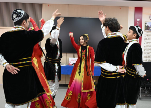 随后,少数民族预科班学生为孩子们表演了一段热情洋溢的民族舞。伴随欢快的旋律,学生们以灵动的舞姿展现维吾尔族舞蹈的独特魅力,旋转的裙摆与孩子们灿烂的笑脸交相辉映。这场文化互动不仅为孩子们送去温暖陪伴,更架起民族文化交流的桥梁,让民族团结、友爱互助的种子在童心中悄然生长。