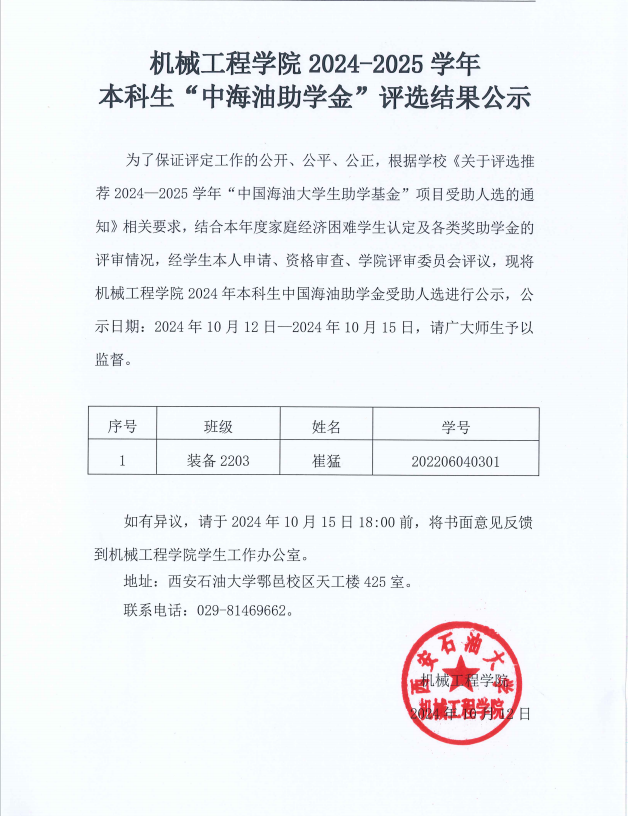 AC米兰中文2024-2025学年本科生“中海油助学金”评选结果公示