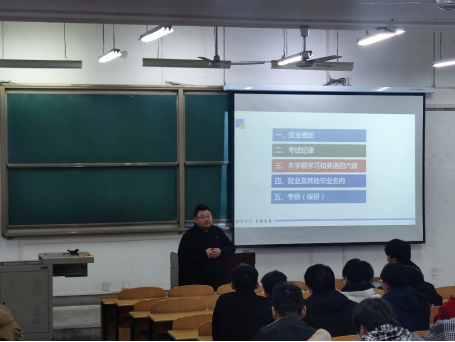 2019级辅导员邱迪老师首先对考研情况和就业现状等进行了详细通报,强调同学们要结合自身实际,合理安排好学业、实习就业、考研复试等各类考试事宜,树立正确的就业观、择业观,认清就业形势,抢抓就业机会,认真做好毕业前的各项准备工作。其次,邱迪老师主要从学校管理要求、校园安全稳定、如何做好毕业设计等方面对同学们做了指导,并再次提醒毕业班全体同学有关毕业的注意事项。最后,邱迪老师对全体2019级本科生提出了四点希望:第一保持良好心态,顺利走完大学最后历程。第二常怀感恩之心,积极配合学院各项工作开展。第三坚持读书和学习,实现更美好的自己。第四坚守底线,脚踏实地,继续为梦想而奋发有为。