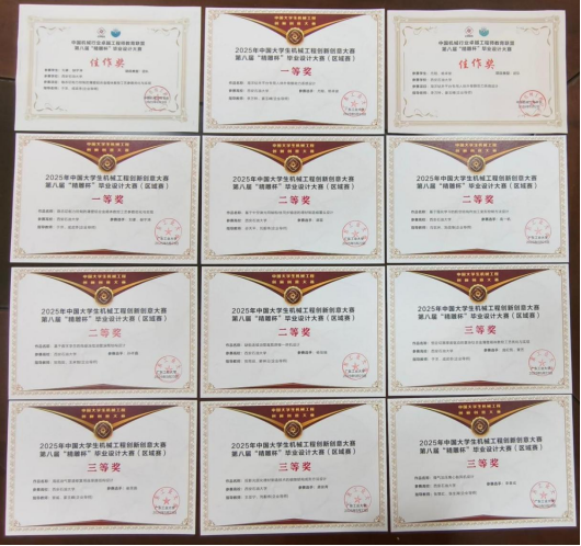 2025年6月1日-2日,由中国机械工程学会、中国机械行业卓越工程师教育联盟主办,广东工业大学承办的2025年中国大学生机械工程创新创意大赛“精雕杯”毕业设计全国总决赛在广东工业大学顺利举行。大赛经过函评、区域赛、全国决赛等环节角逐,我校2件区域赛一等奖作品直通全国总决赛,并获得全国佳作奖。本次大赛我校共提交作品20件,其中,获一等奖2件,二等奖4件,三等奖4件。此次成绩是我院学生参加此项赛事以来历史最好成绩。