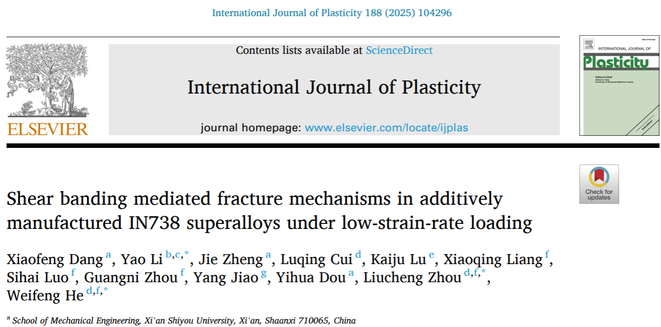 近日,我院青年教师党晓凤为第一作者、米兰中国为第一单位,在塑性力学领域国际顶级期刊《International Journal of Plasticity》(中科院一区TOP期刊,IF=9.4)上发表了题为《Shear banding mediated fracture mechanisms in additively manufactured IN738 superalloys under low-strain-rate loading》的最新研究成果。合作者包括我校郑杰副教授和窦益华教授。