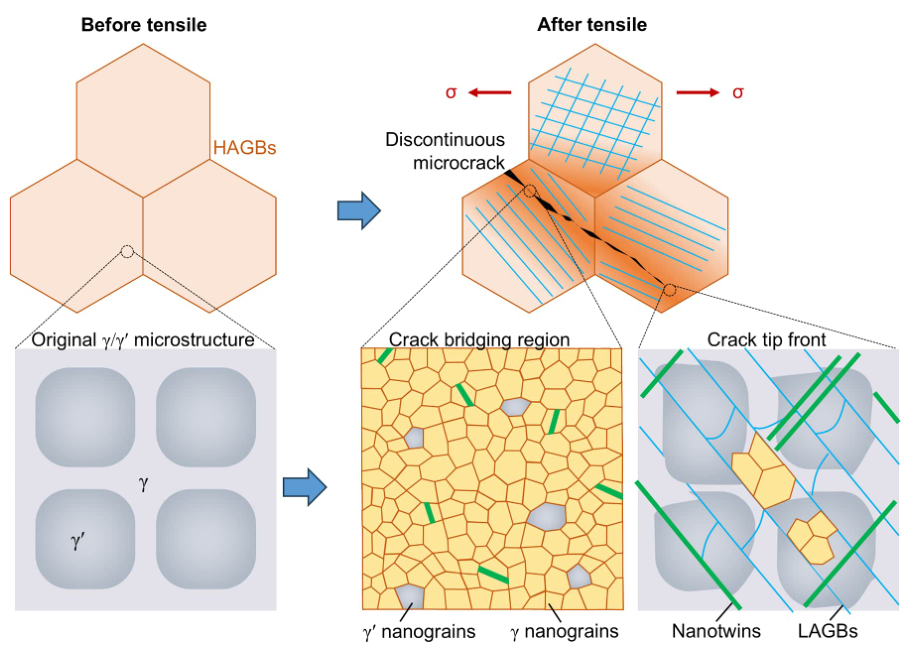 本研究首次揭示了EBPBF制备的IN738高温合金在低应变率(1×10⁻³ s⁻¹)拉伸载荷下剪切带介导的断裂新机制。通过优化电子束扫描策略与热场控制,成功制备出缺陷率低、柱状晶<001>织构显著的致密高温合金,其性能优于铸造IN738合金。研究发现,EBPBF工艺制备的高温合金中纳米碳化物均匀分布,有效抑制裂纹萌生,并通过剪切带作用实现穿晶断裂。裂纹扩展路径中形成的剪切带伴随γ'强化相纳米化与动态再结晶现象,通过位错滑移与孪生协同作用耗散裂纹能量,显著提升了合金的裂纹扩展阻力。该研究为高性能高温合金的可靠性设计提供了理论支撑。