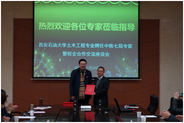 学院院长窦益华首先为新聘中铁七局专家石磊颁发聘书,聘任石磊为土木工程专业建设委员会副主任。石磊,教授级高工,现任中铁七局集团西安铁路工程有限公司副总经理、总工程师,中铁七局集团一级技术专家,河南省城市轨道交通工程专家库专家。聘书颁发仪式结束后,学院领导、系领导及来宾先后介绍了AC米兰中文、土木工程系、中铁七局西铁工程有限公司的发展历程,并就新形势下如何推进产、学、研融合工作做了深入交流。双方结合学校要求以及企业实际,就土木工程系校企合作未来方向提出新思路、新建议。座谈会上,石磊副总经理在充分肯定我系前期科研技术服务及校企对接工作取得成效的基础上,结合中铁七局西铁工程有限公司实际人才需求,期望校企在桥梁施工工法、BIM技术人才及科研人才连续培养方面做出进一步的合作,并与我院就联合设置BIM工作室、本科生实训基地,培养贴近企业实际需求的人才等方面进行了探讨。